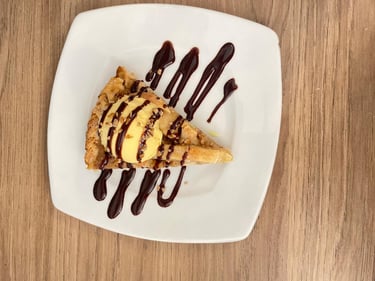Elaborada con masa suave y manzana natural caramelizada, servida con helado de vainilla y un toque de nuez.