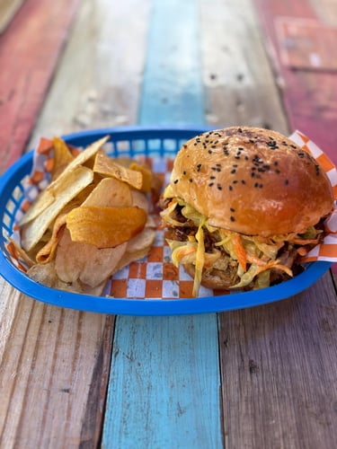 Deliciosa espaldilla ahumada deshebrada, bañada con nuestra receta de salsa BBQ y ensalada coleslaw, en pan brioche artesanal acompañado de chips de plátano o papa.